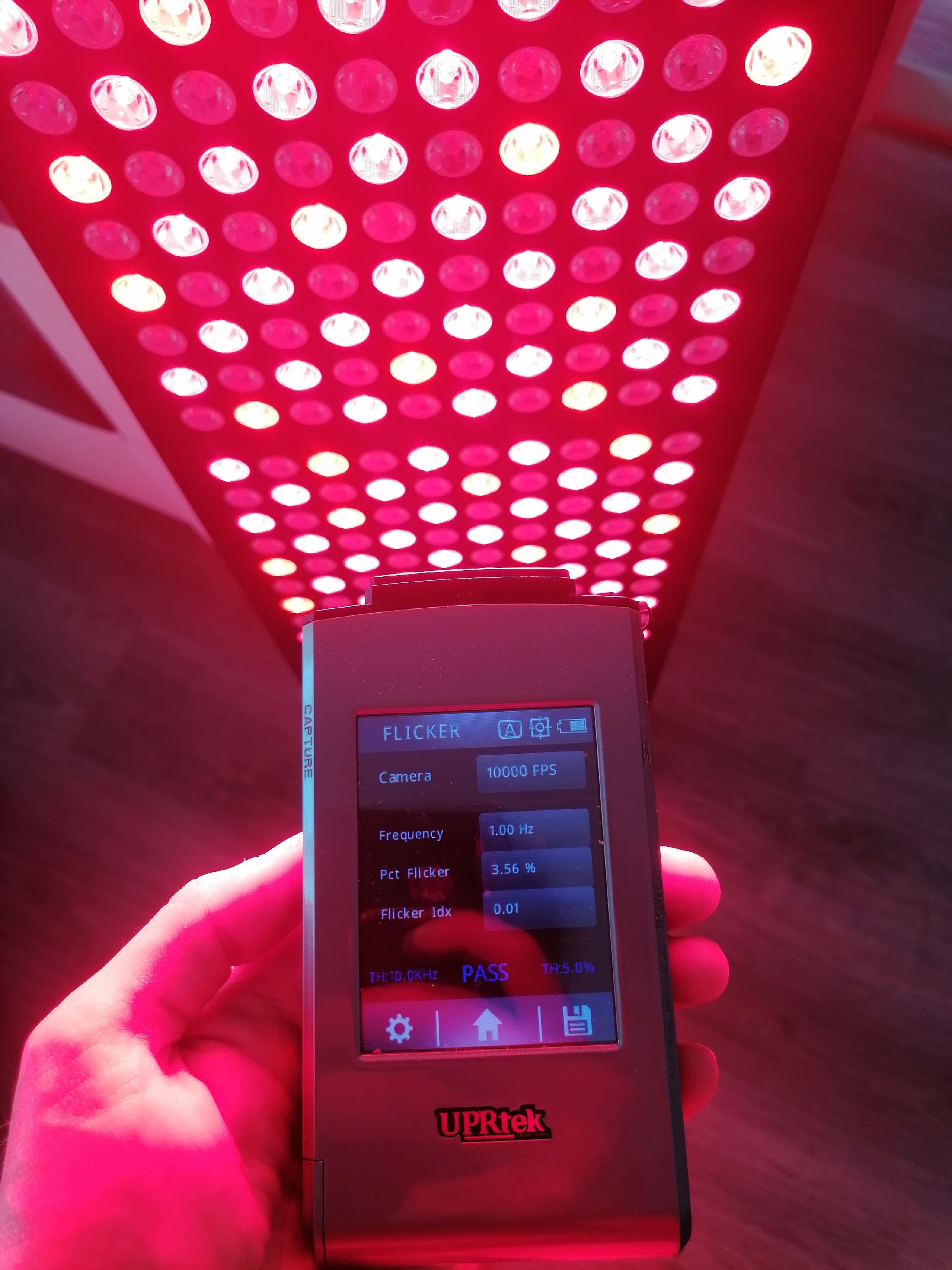 Naše panely obsahují velmi kvalitní LEDky i čipy, díky čemuž světlo z panelů nebliká (tzv. Flicker free). Blikání je redukováno a můžete ho vidět i na fotce z měření přímo spektrometrem.