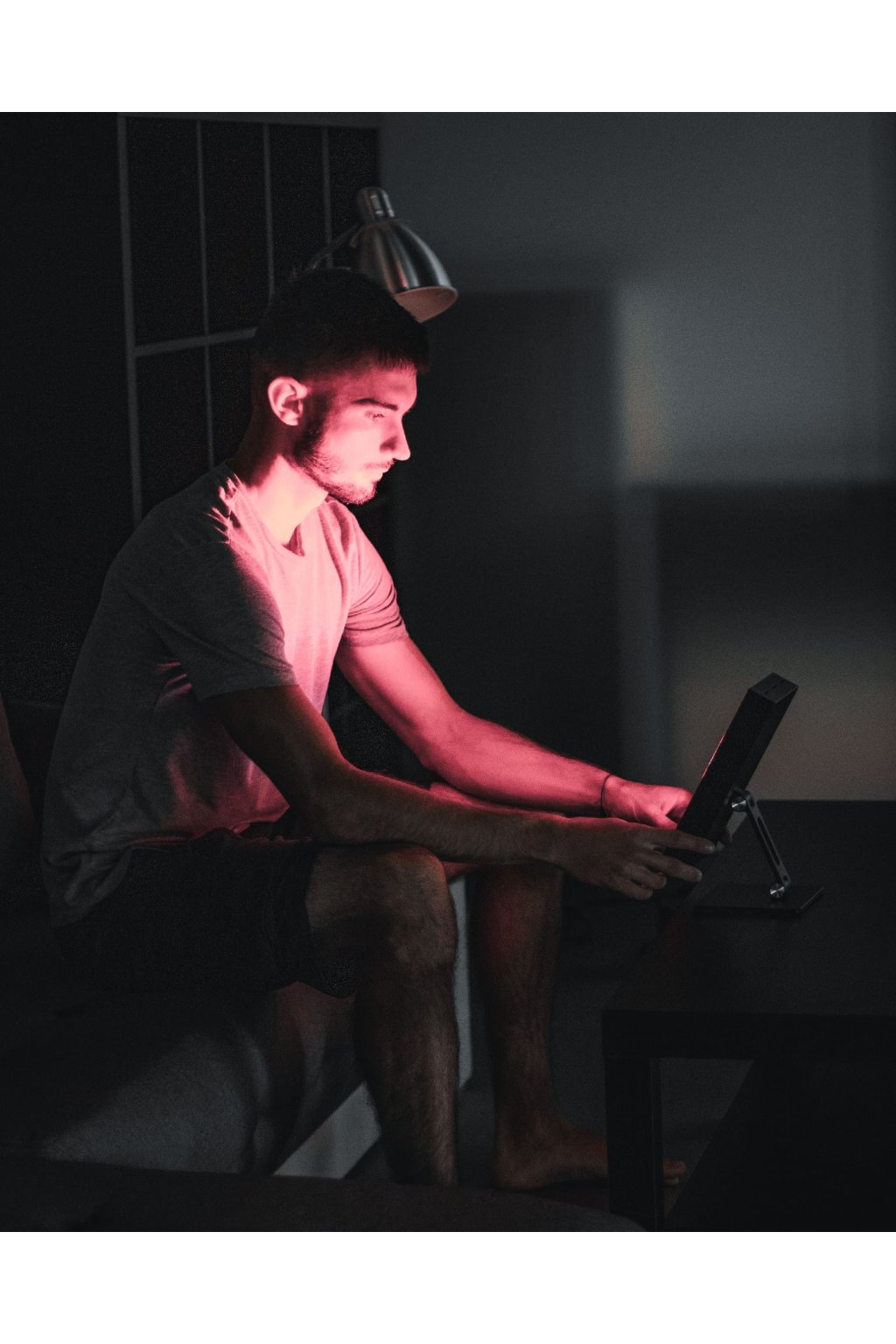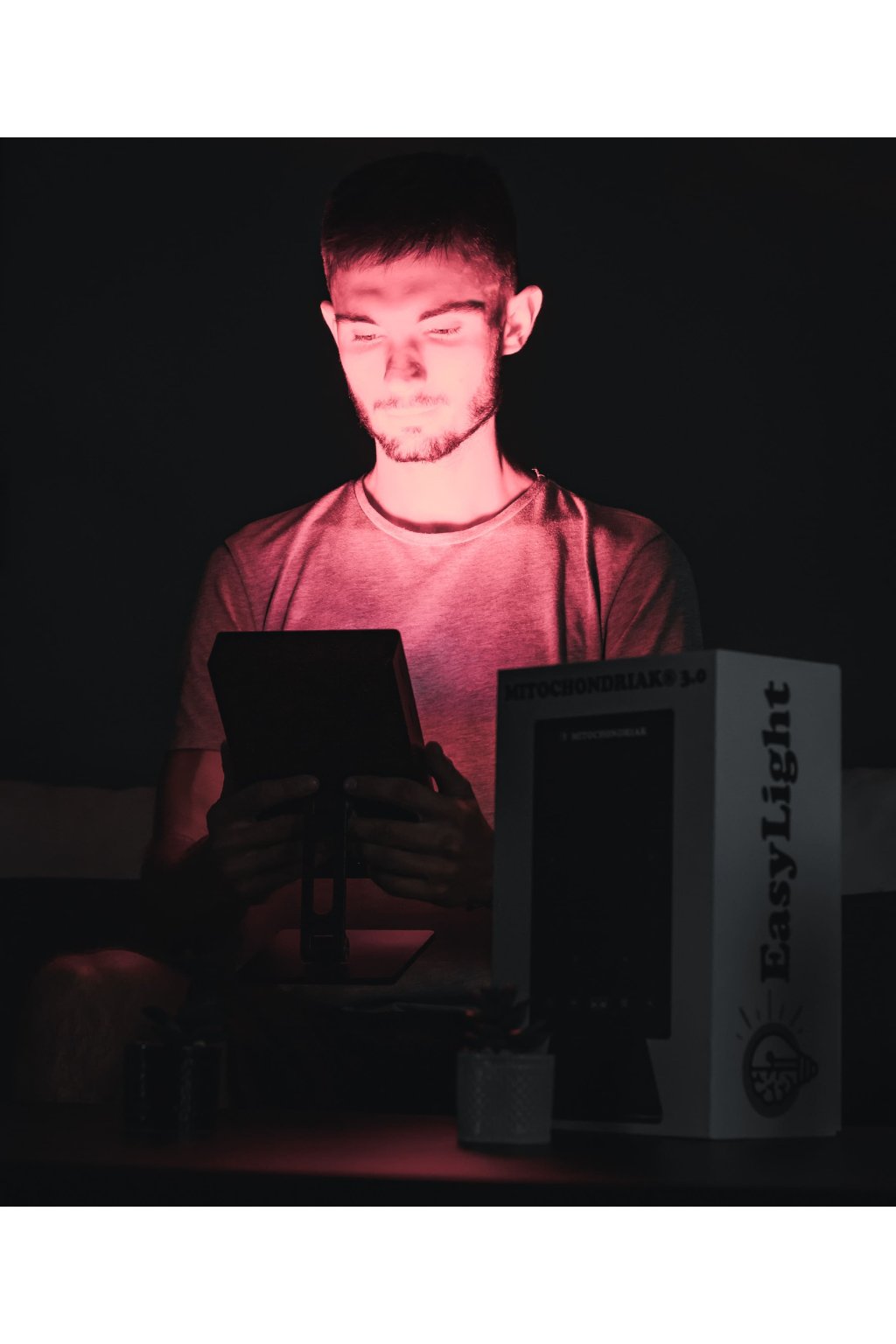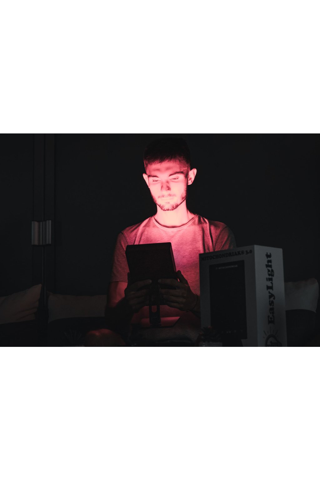 Je na baterky, tedy bezpečný, bez flickeru i EMF. Je přenosný a můžete ho vzít i do ruky a využít jako lokální terapii (např. osvícením žil na ruce/noze) pro podporu tvorby oxidu dusnatého nebo podporu mitochondrií a produkce vody v dané tkáni.
